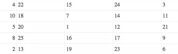 從1開到25,用手指指著數(shù)字找完25個數(shù)。時間要求越來越快。待孩子練熟后,再制作新的表格。五歲以上的孩子要求練習(xí)到一分鐘看完。